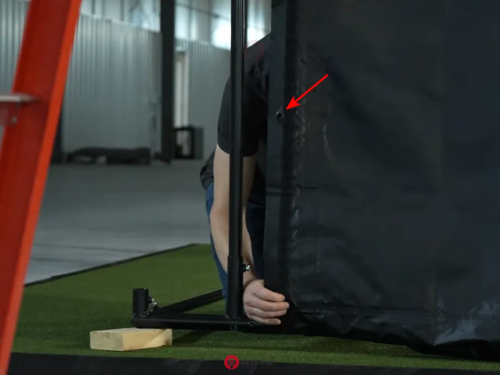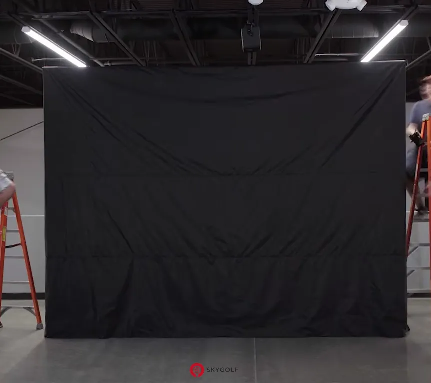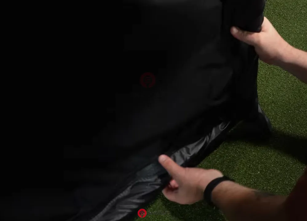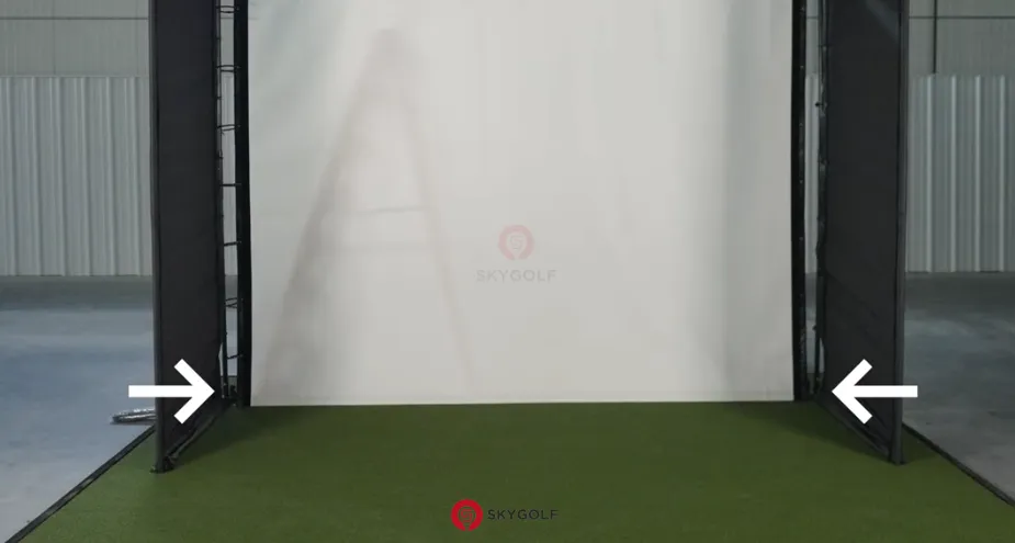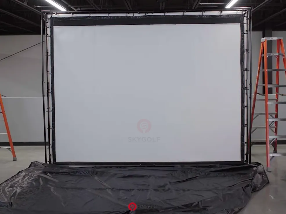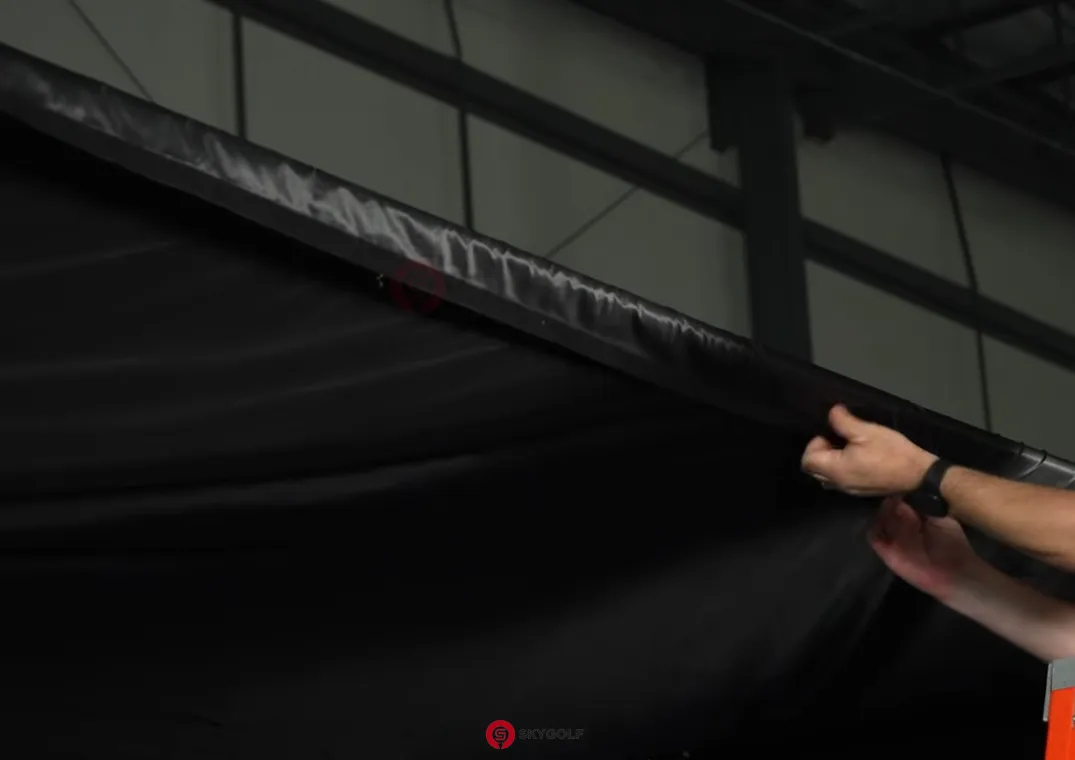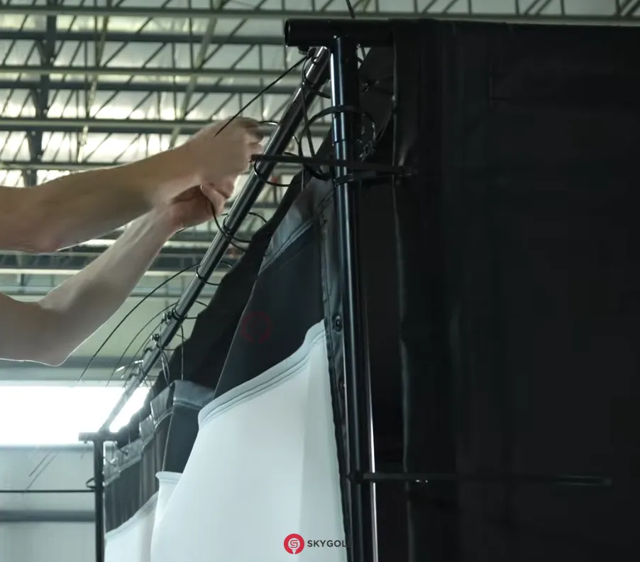 Treo màn hình: Trải màn hình mặt có logo Skygolf nằm ở góc trên bên trái. Dùng dây rút treo lỏng màn hình từ trên xuống. Lưu ý: Không siết quá chặt, chỉ cần màn hình phẳng.