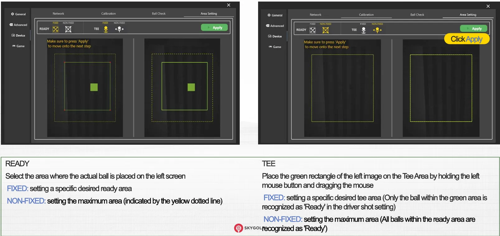Tiếp theo tới phần cài đặt vùng nhận bóng của tee, nếu như bạn có một tee cao su cố định hãy chọn vùng cho nó, nhưng phải đảm bảo rằng điểm bạn chọn là chính xác, nếu không cảm biến sẽ không nhận bóng khi để trên tee