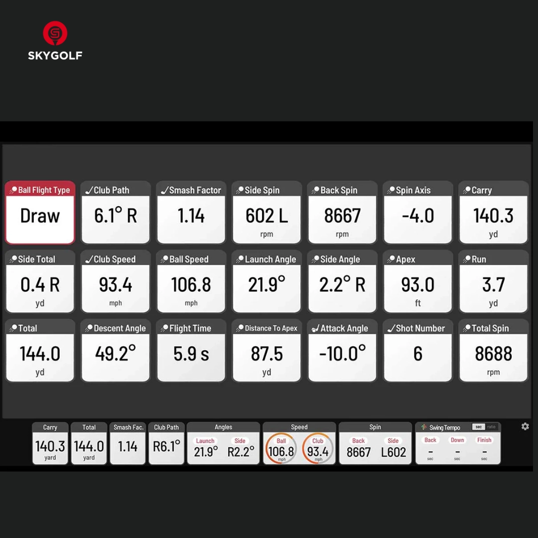Sau mỗi cú đánh, EYE MINI LITE sẽ hiển thị đường bay của bóng trên màn hình mô phỏng, kèm theo các dữ liệu chi tiết như: